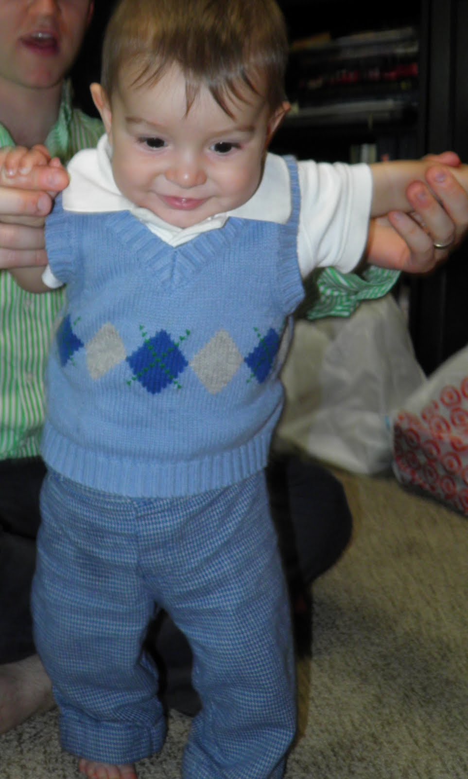 Your mobility has grown exponentially this month. While you were always big on rolling to get from place to place, you started army crawling in between your 6th and 7th months. For a while there, I thought you would maybe be one of those babies that skips crawling; you rolled with purpose, and weren't showing any signs of even being interested in crawling. Then, all of a sudden one day, you were up on your knees without me even noticing. Now, you move along faster than I usually realize. It is getting increasingly tricky to perform minor errands such as making dinner or even going to the bathroom because I can't be certain that you won't get into all kinds of mischief if I avert my eyes even for a minute.